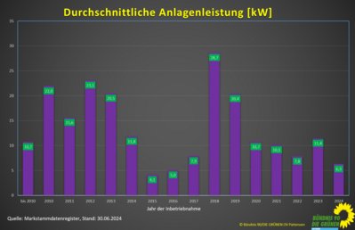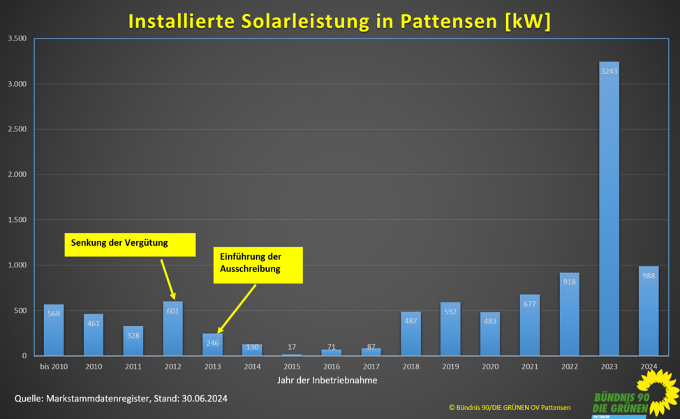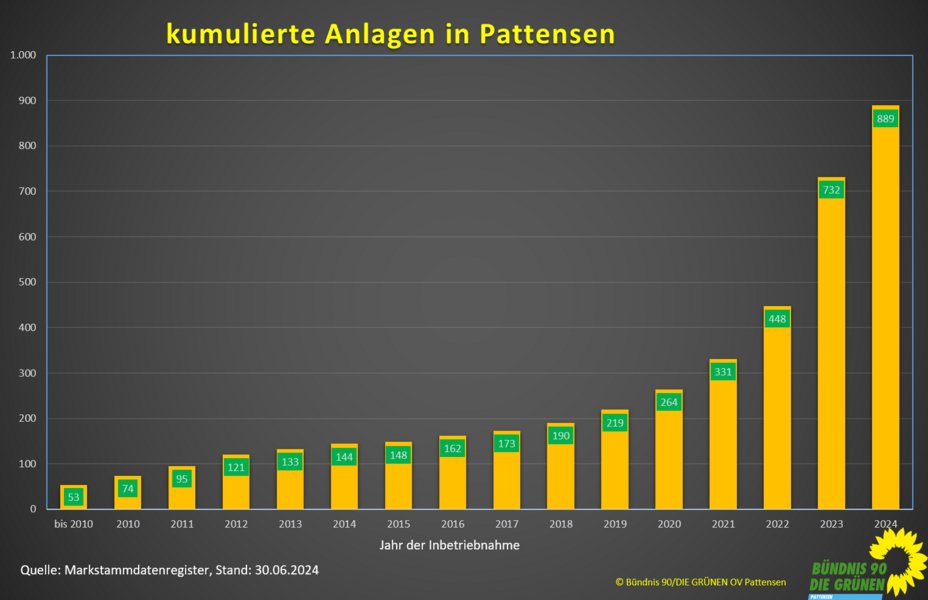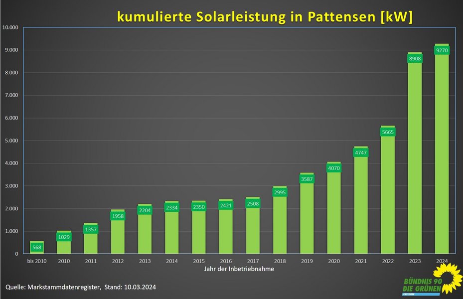 Eine aktuelle Auswertung des Markstammdatenregisters. Es zeigt eine Verdreifachung der installierten PV-Leistun in 2023 gegenüber 2022. Mit Knapp 9 MW installierter Leistung durch Solaranlagen bis Ende 2023 und 732 Anlagen insgesamt. Mitte 2024 sind 889 Anlagen mit einer Leistung von fast 10 MW istalliert. Teilweise wird der Strombedarf von Pattensen zu fast 100 % durch Solarstrom gedeckt.