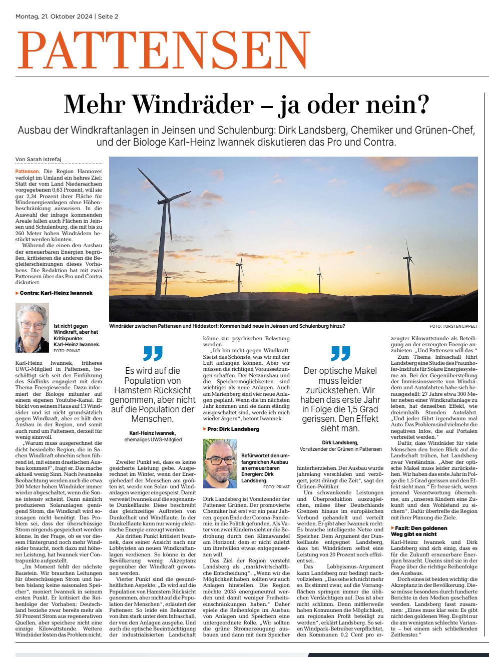 HAZ vom 21.10.2024 - Wir erhielten eine Anfrage der HAZ für ein Streitgespräch zum Thema Windkraft in Pattensen. Zwei Stunden wurden Argumente ausgetauscht, Gemeinsamkeiten und Unterschiede festgestellt und Prioritäten diskutiert. Leider haben es zu wenig Daten und Zahlen nicht in den Artikel geschafft, was bei der Gesprächsfülle auch nachvollziehbar ist. So müssen wir beachten, dass die Treibhausgasneutralität in der Region Hannover für 2035 und für das Land Niedersachsen für 2040 angestrebt ist. Einig waren wir, dass dafür ein konsequenter Ausbaus der Windkraft nötig ist. Was die nötigen Speicherkapazitäten angeht, hat das Fraunhofe ISE für 2030 einen Bedarf von 83 GWh errechnet. Eine Großanlage z.B. in Alfeld (275 MWh) ist dafür ein guter Meilenstein. Aus unserer Sicht müssen beide Pfade, ohne "Bremsung" des Windkraftanlagenausbaus, konsequent beschritten werden. Und wenn die Region Hannover dafür geeignete Potentialflächen besitzt, sollten wir diese nutzen, um auch die möglichen Haushaltseinnehmen daraus beanspruchen zu können.